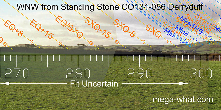 At Derryduff, a large stone stands on a broad flat hilltop, its long axis is NE/SW (226°). There is a useful horizon to the northwest but all else seemed rather flat and featureless and has not yet been surveyed. However, the remainder of the horizon has been calculated using SRTM 30m data and the full panorama may be seen here: [PanPic].