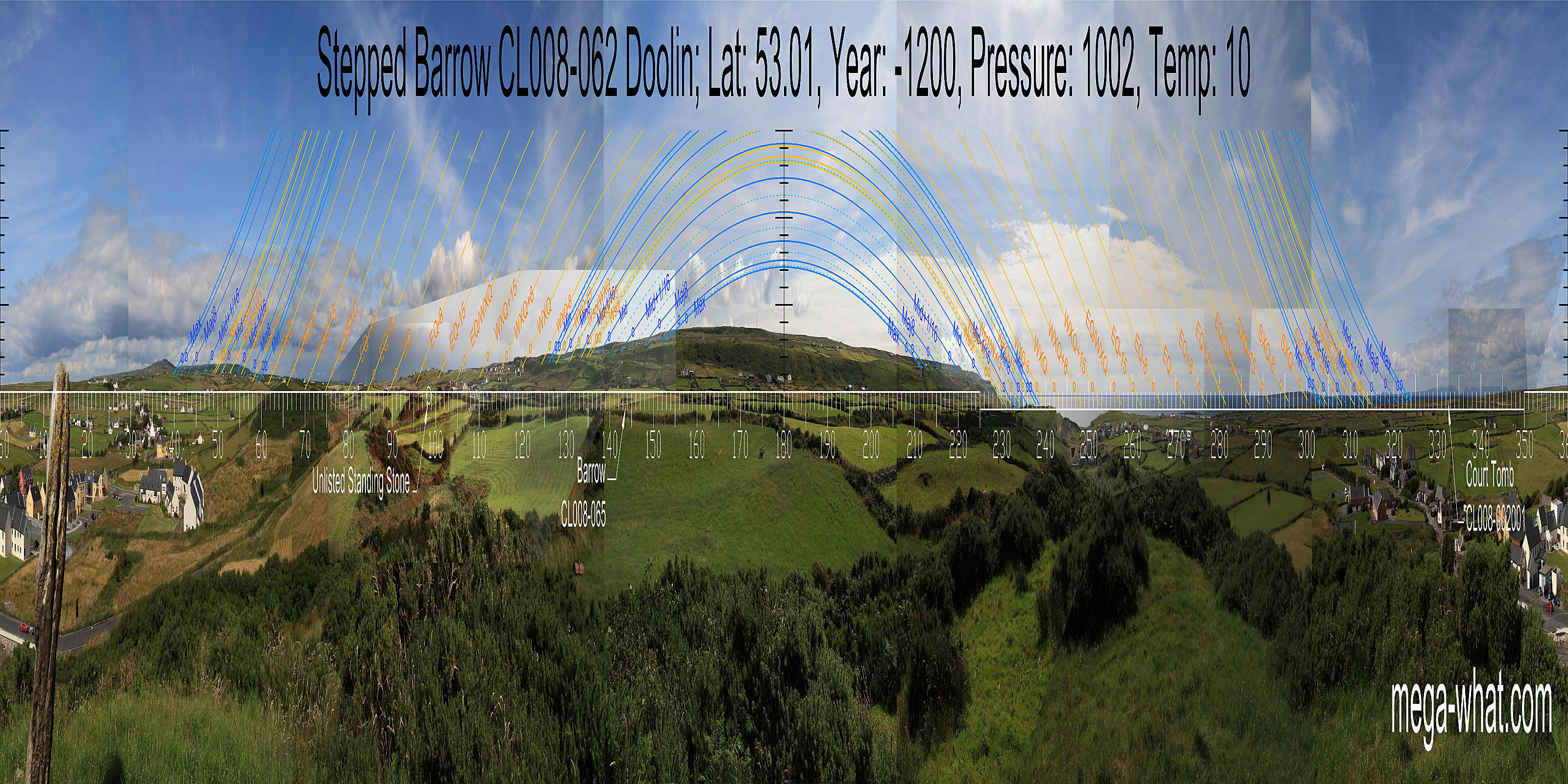 Orange lines mark the annual solar round. Lunistice positions over the 18.6 year lunar nodal cycle are blue. More about the Solar Calendar More about the Lunar Calendar More about this placeLook North