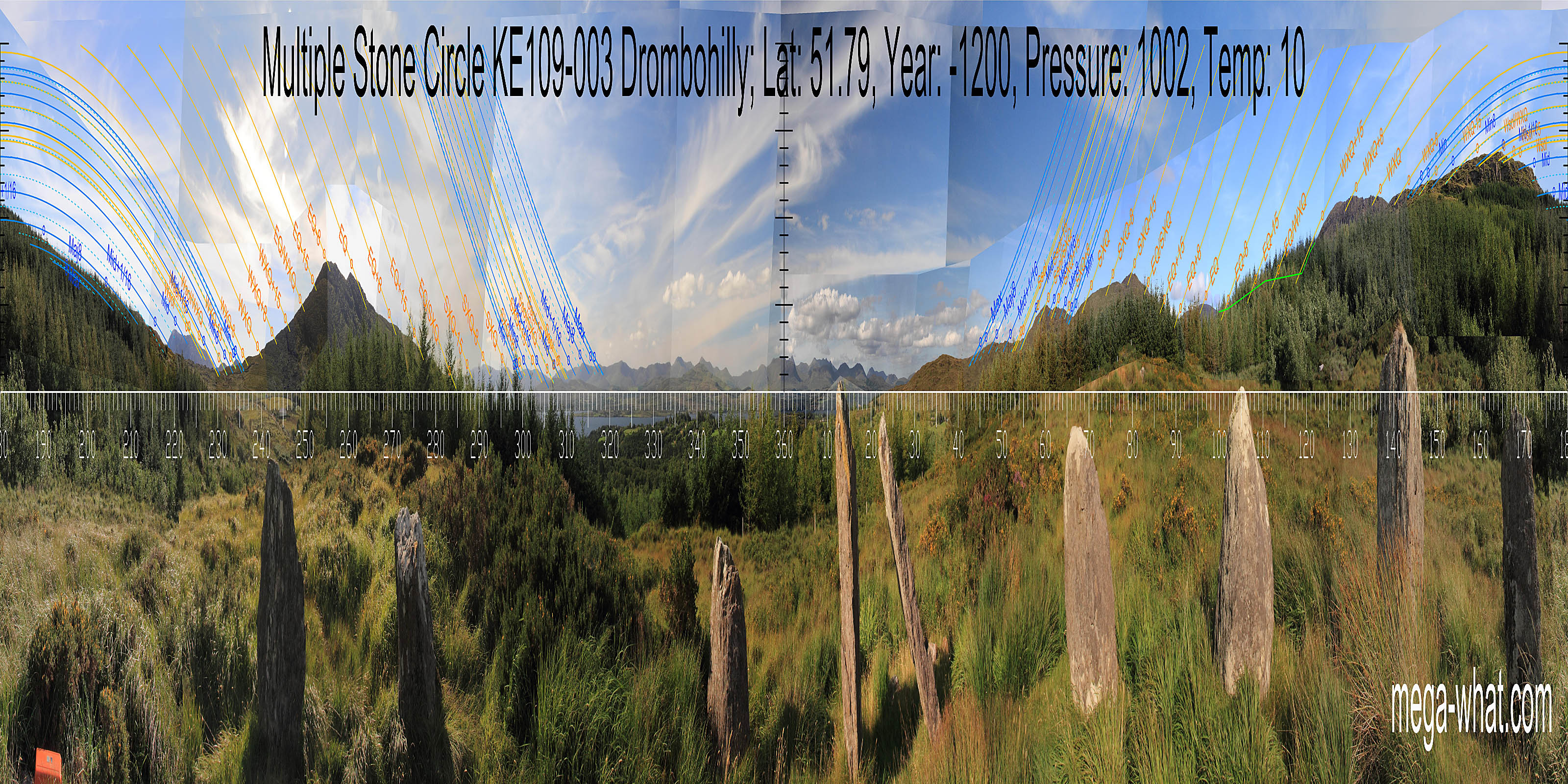 Orange lines mark the annual solar round. Lunistice positions over the 18.6 year lunar nodal cycle are blue. More about the Solar Calendar More about the Lunar Calendar More about this placeLook South