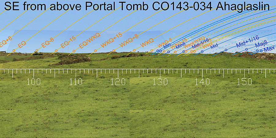 It therefore seems likely that the reason for siting the tomb down on the slope was not just to get the half-month from summer solstice accurately on Burgatia Hill's highest point but also to fine tune the intersect of western hill and more distant south-western ground. Additionally, there is the approximate symmetry of the SW and NW intersects and the mirroring of the western hill by the eastern local hump.