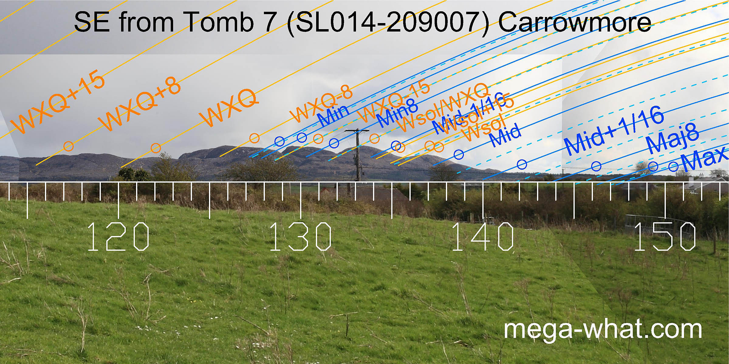Orange lines mark the annual solar round. Lunistice positions over the 18.6 year lunar nodal cycle are blue. More about the Solar Calendar More about the Lunar Calendar More about this placeLook North