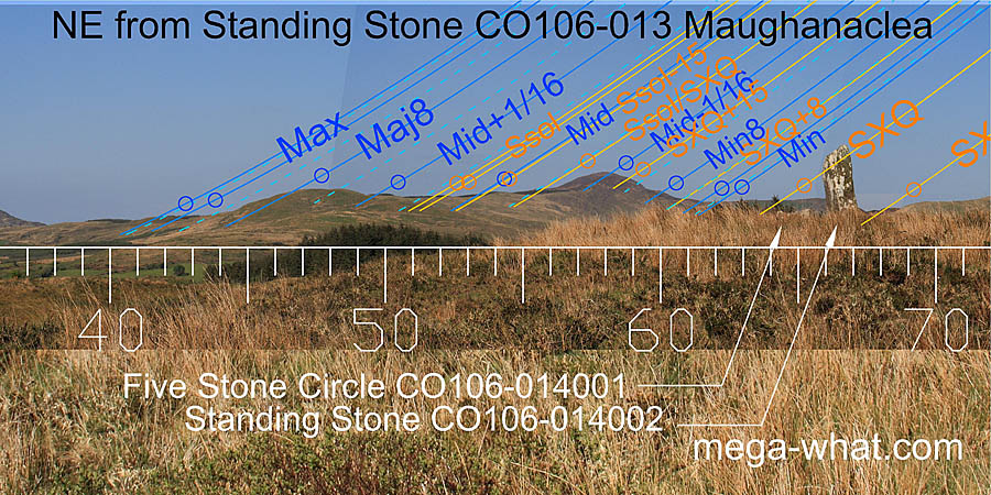- A Standing Stone beside a Five Stone Circle cuts the horizon only 40m to the ENE (66°). It is probably co-temporaneous with this one and the circle is likely to be a later addition. Differences between the two positions are negligible to the north, slight to east and west but significant to the south. Unfortunately the original precision is now obscured by trees.