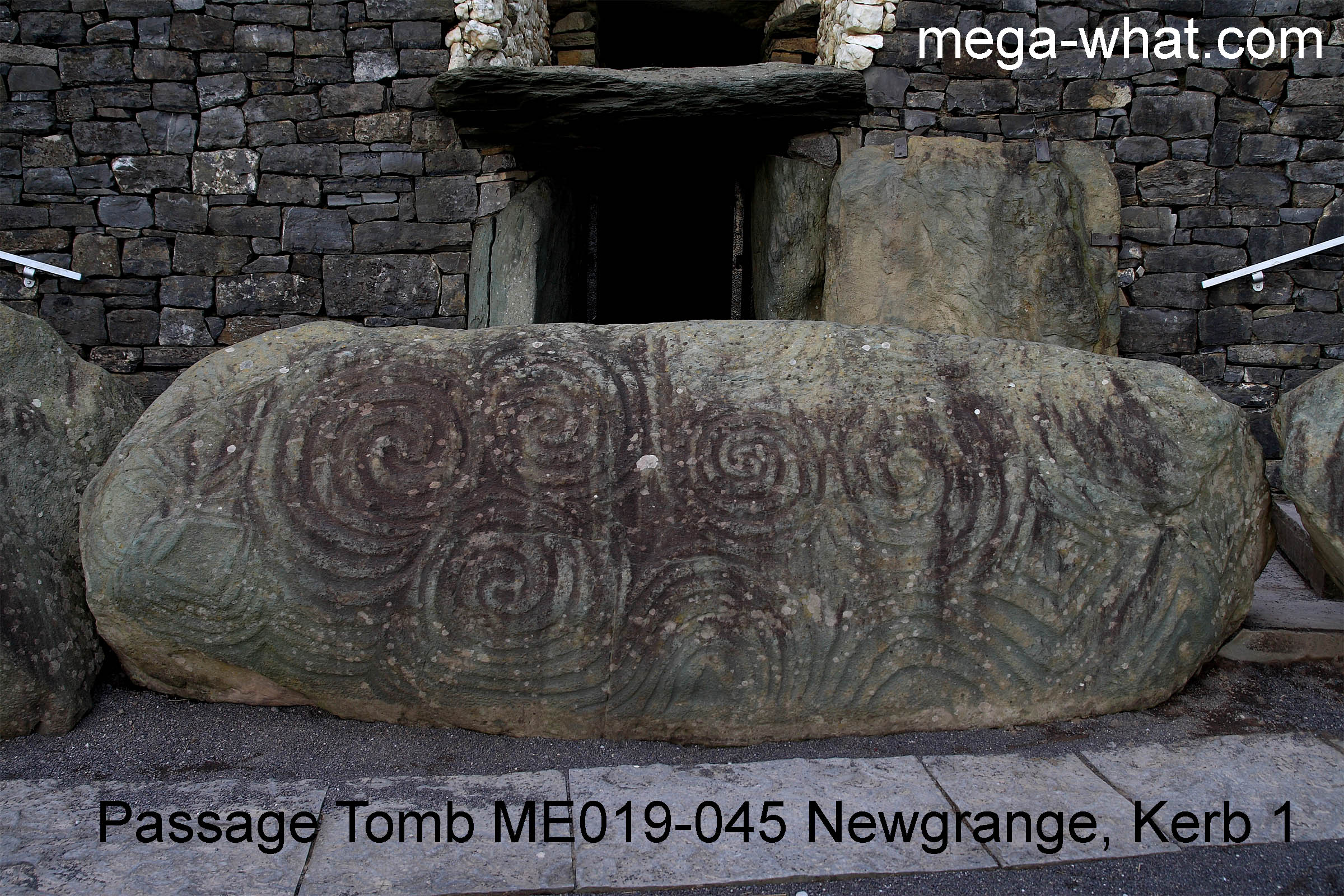 - Kerb 1 is the stone outside the entrance and thus faces winter solstice sunrise. This is the one with the triple spiral.