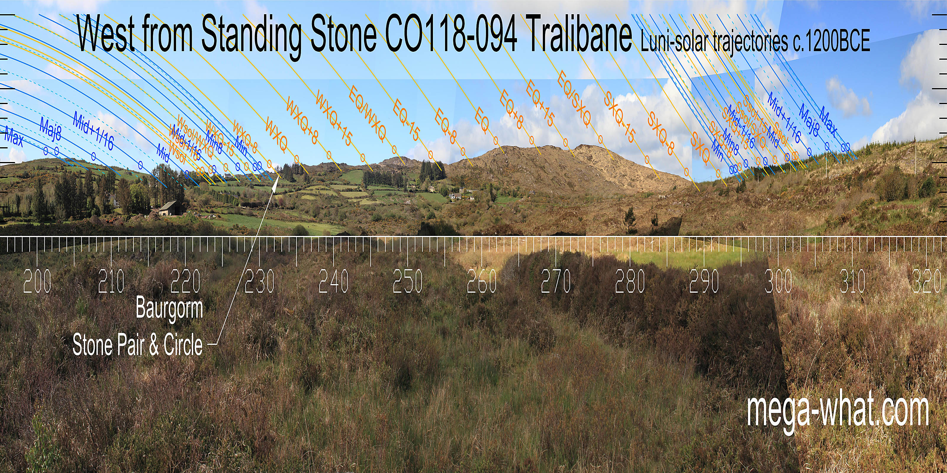 Orange lines mark the annual solar round. Lunistice positions over the 18.6 year lunar nodal cycle are blue. More about the Solar CalendarMore about the Lunar Calendar More about this placeLook East